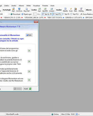 Momentum è un programma per l'Analisi Tecnica e la Gestione Avanzata dei Portafogli di Titoli, Fondi o qualunque altro strumento finanziario. E’ attualmente l'unico software che dispone di allarmi in tempo reale sulla perforazione delle trendline tracciate dall'utilizzatore, un nuovo Sistema Automatico di Analisi delle Obbligazioni e Scansione Titoli, oltre ai tradizionali Stop Loss, Take Profit, Trailing Stop e Trading Systems (TS ottimizzabile con Algoritmo Genetico) ed alle Funzioni per la Forza Relativa e DEMA.