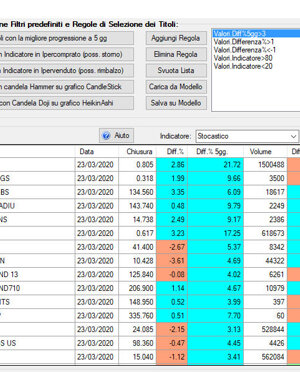 Possibilità di utilizzare ogni opzione della finestra Scan Titoli per elaborare N. periodi generici (giorni, settimane, mesi ecc.), sfruttando così il Time Frame selezionato in tutti i comandi ed analisi (ricerca figure HA o Candlestick, differenza % a N. periodi, differenza % volumi, Indicatori ecc.)